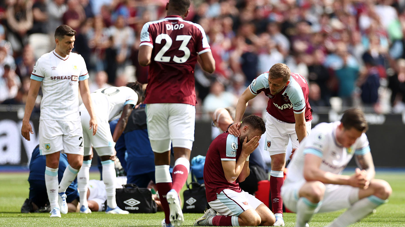 Burnleys Ashley Westwood was stretchered off with a serious leg injury after a collision with Nikola Vlasic that left the West Ham player.